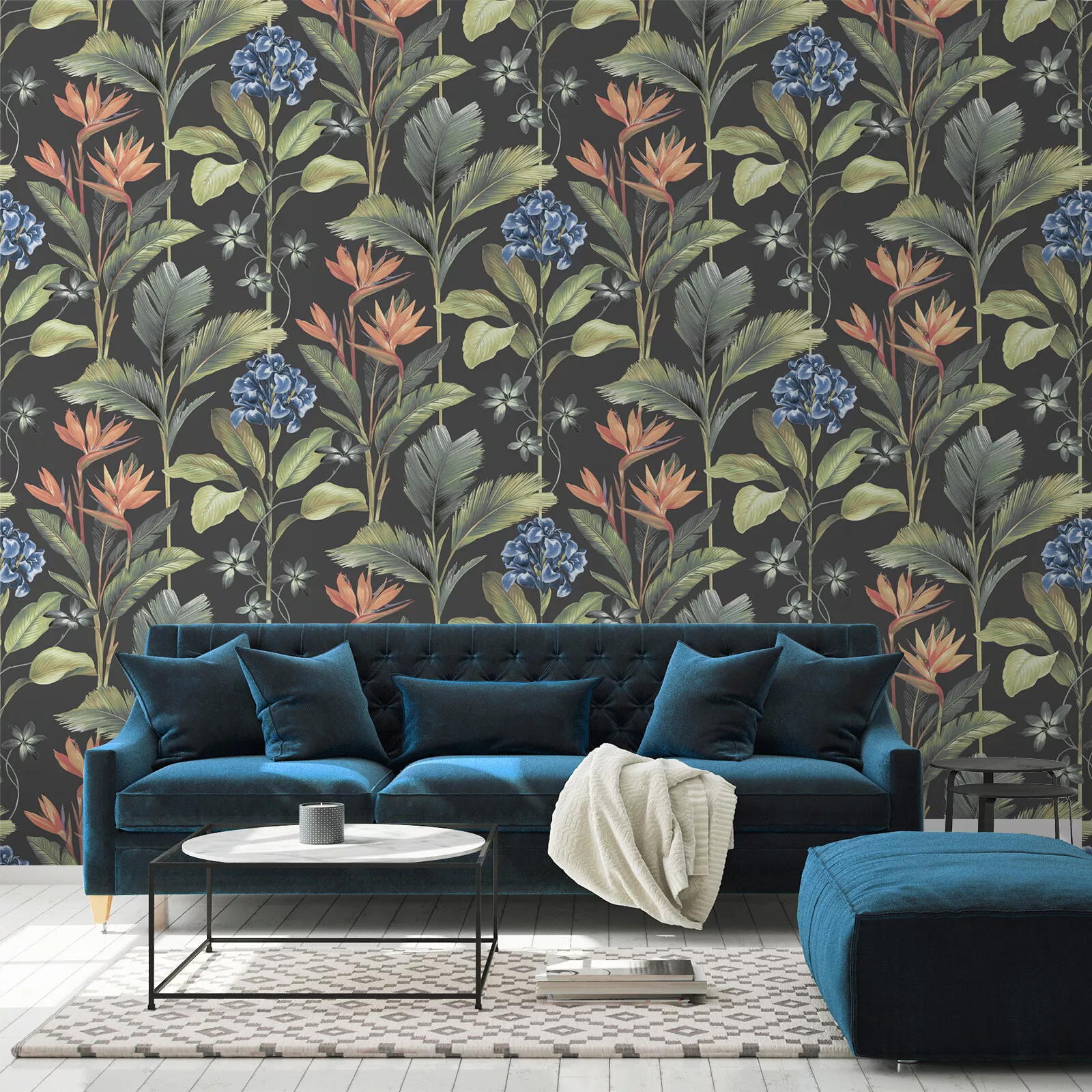 Belgravia Decor?s Oliana Floral Charcoal Wallpaper (8484) offers a bold, tropical aesthetic with a sophisticated edge. This design features hand-painted style palm leaves in rich green tones, interwoven with vibrant blue and orange tropical flowers. The lush botanical imagery is set against a deep charcoal grey background with a smooth matte finish, creating a striking contrast that enhances the vivid colours. Ideal for feature walls or full-room applications, this high-quality wallpaper is easy to apply using the paste-the-paper method. It is washable, peelable, and has good lightfastness, making it both practical and stylish. Each roll measures 10m x 0.53m with a 64cm offset pattern repeat.