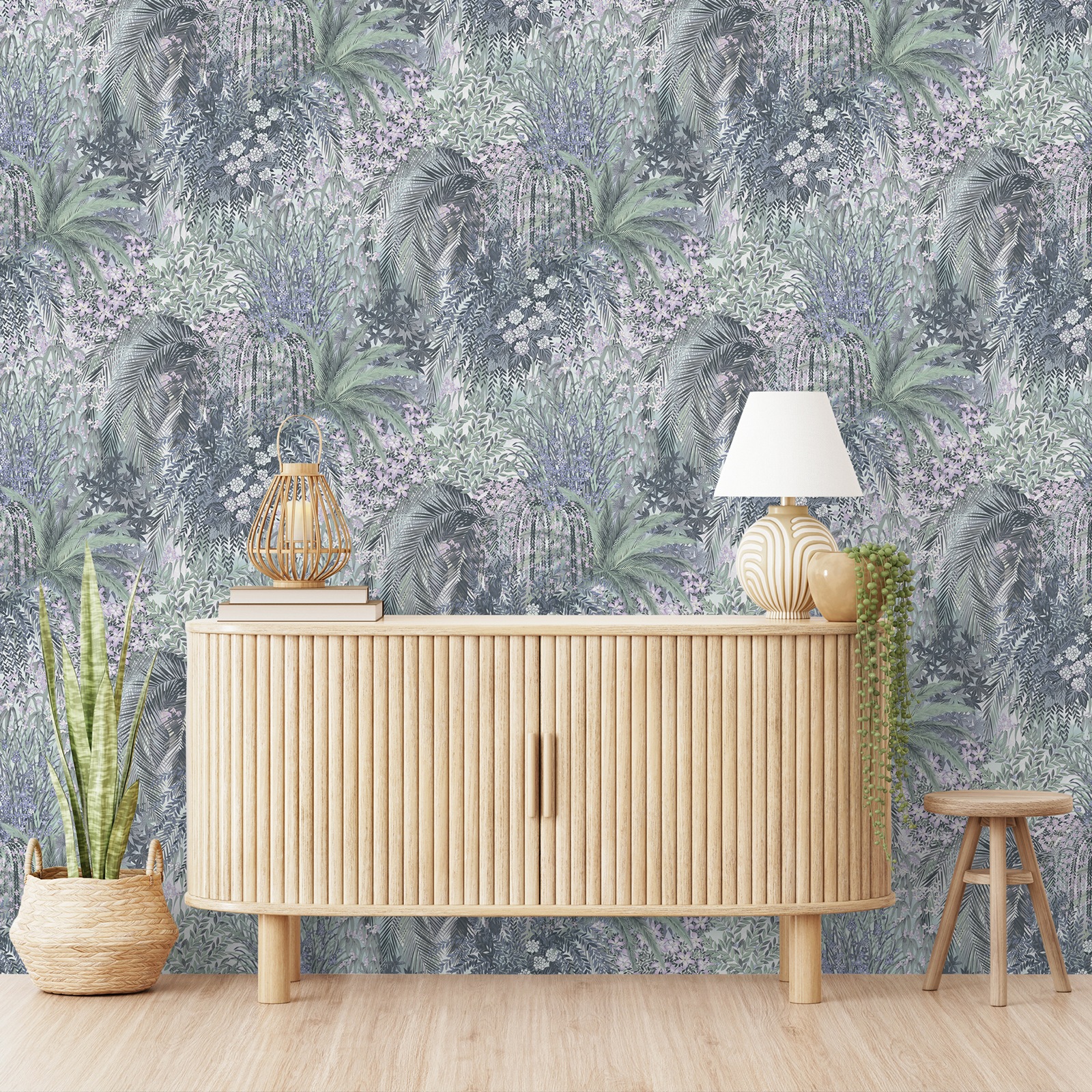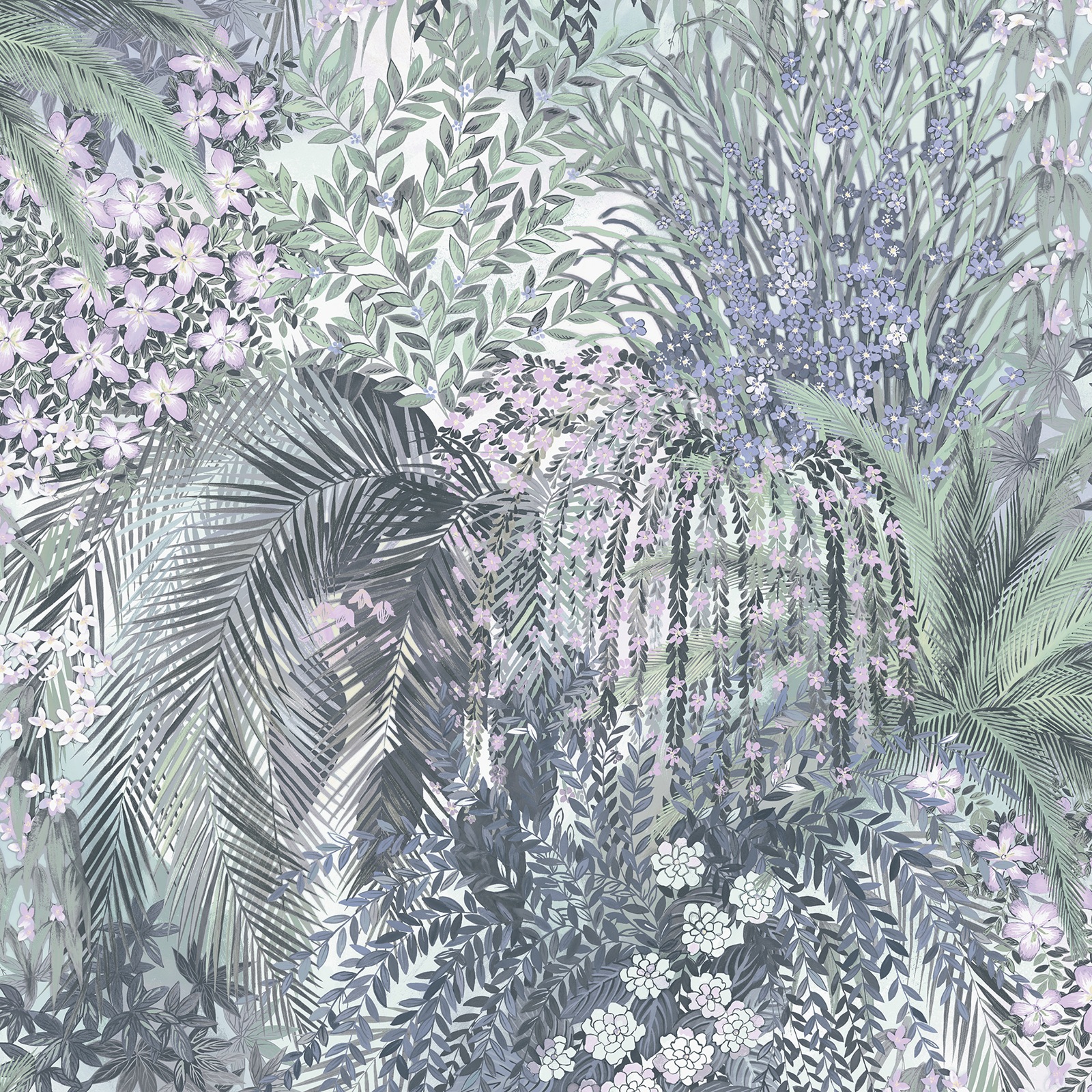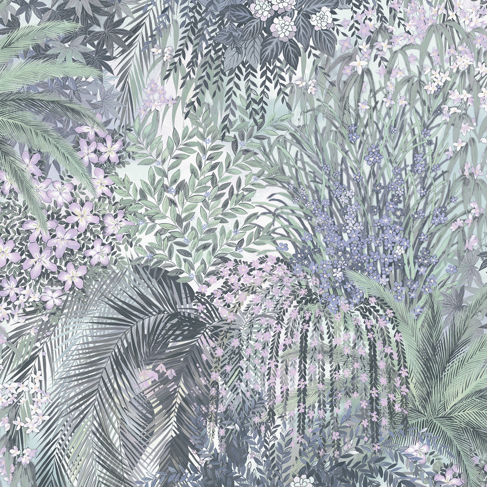 Paradise Blue Purple Floral Green Leaf Pattern Smooth Finish Feature Wallpaper