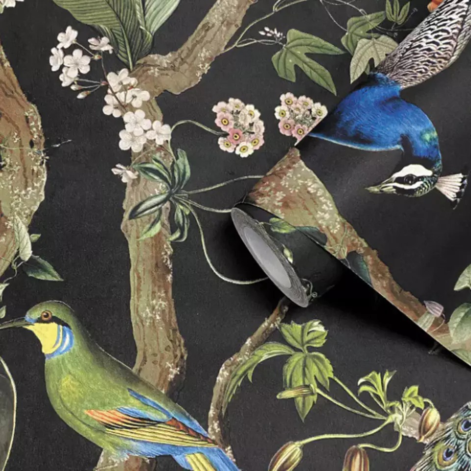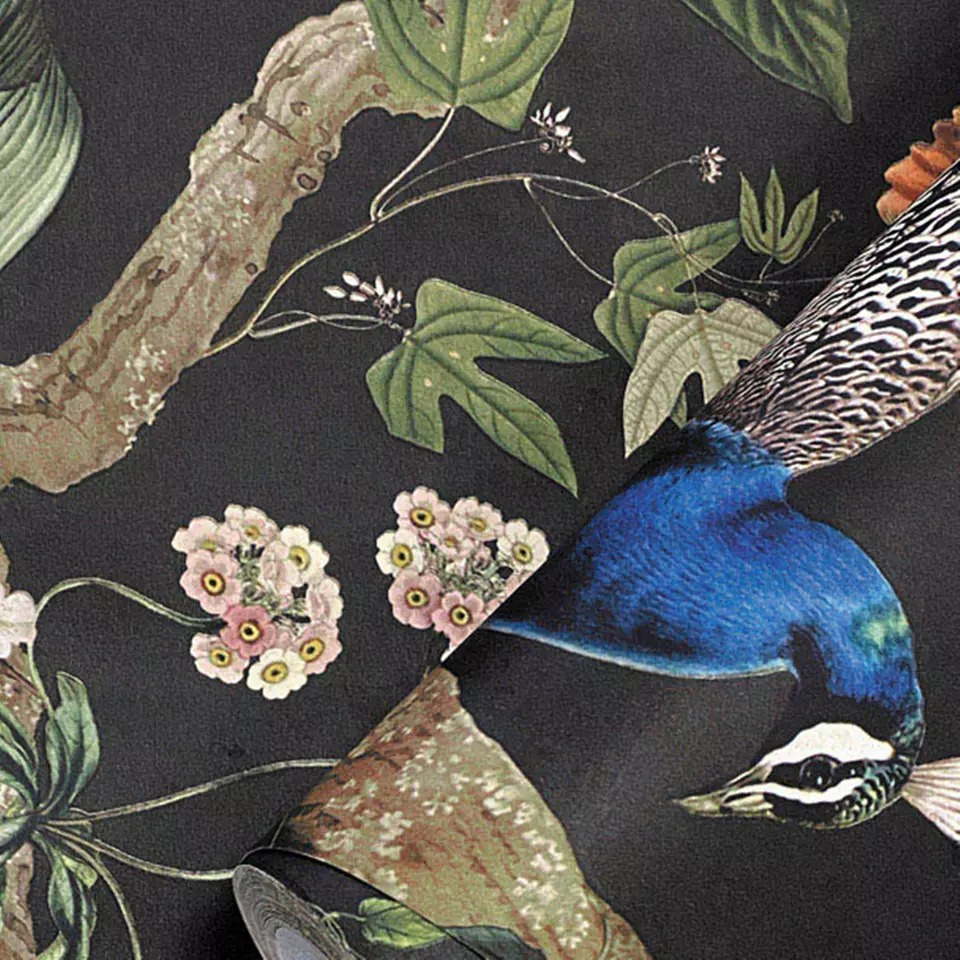 The Holden Décor wallpaper (13681), known as Charcoal Peacock Woods, features a captivating design with green floral elements and multiple birds. This wallpaper brings a touch of nature indoors, creating a serene and enchanting atmosphere. The dark charcoal background enhances the vibrant green foliage and colorful birds, making them stand out beautifully. Ideal for a feature wall in a bedroom, this wallpaper adds depth and character to your space. Its high-quality material ensures durability and easy maintenance, making it a perfect choice for creating a stylish and tranquil environment.