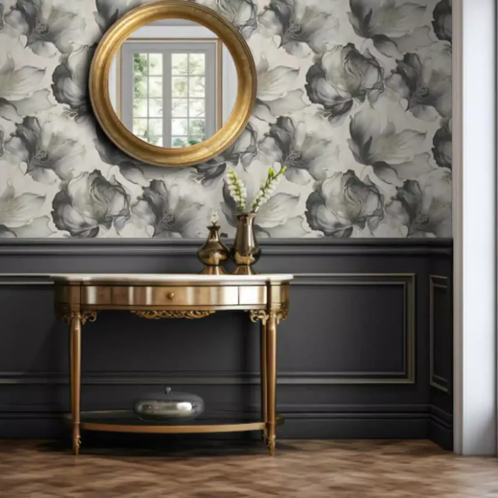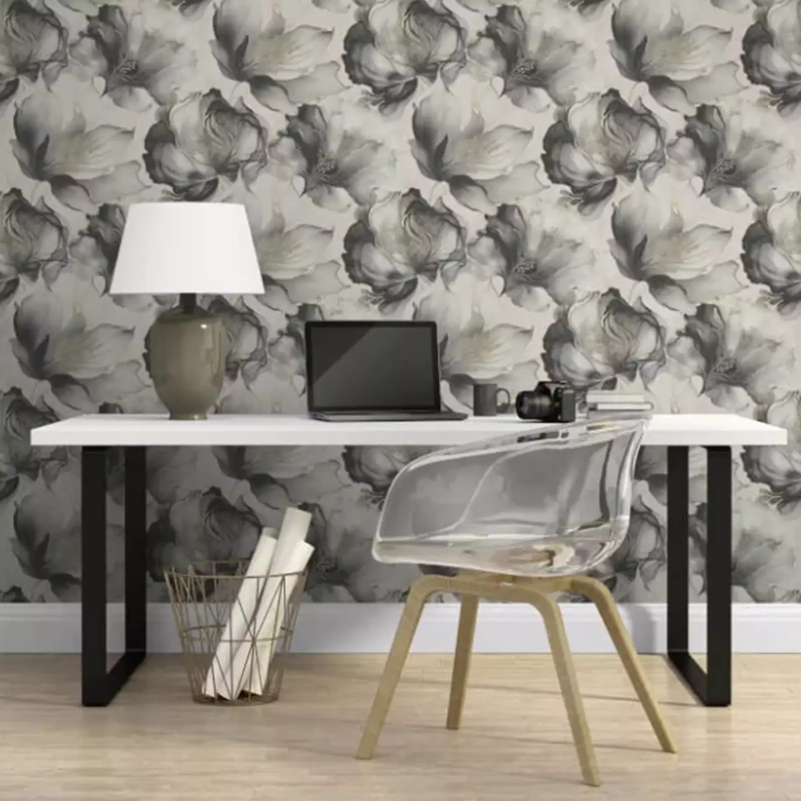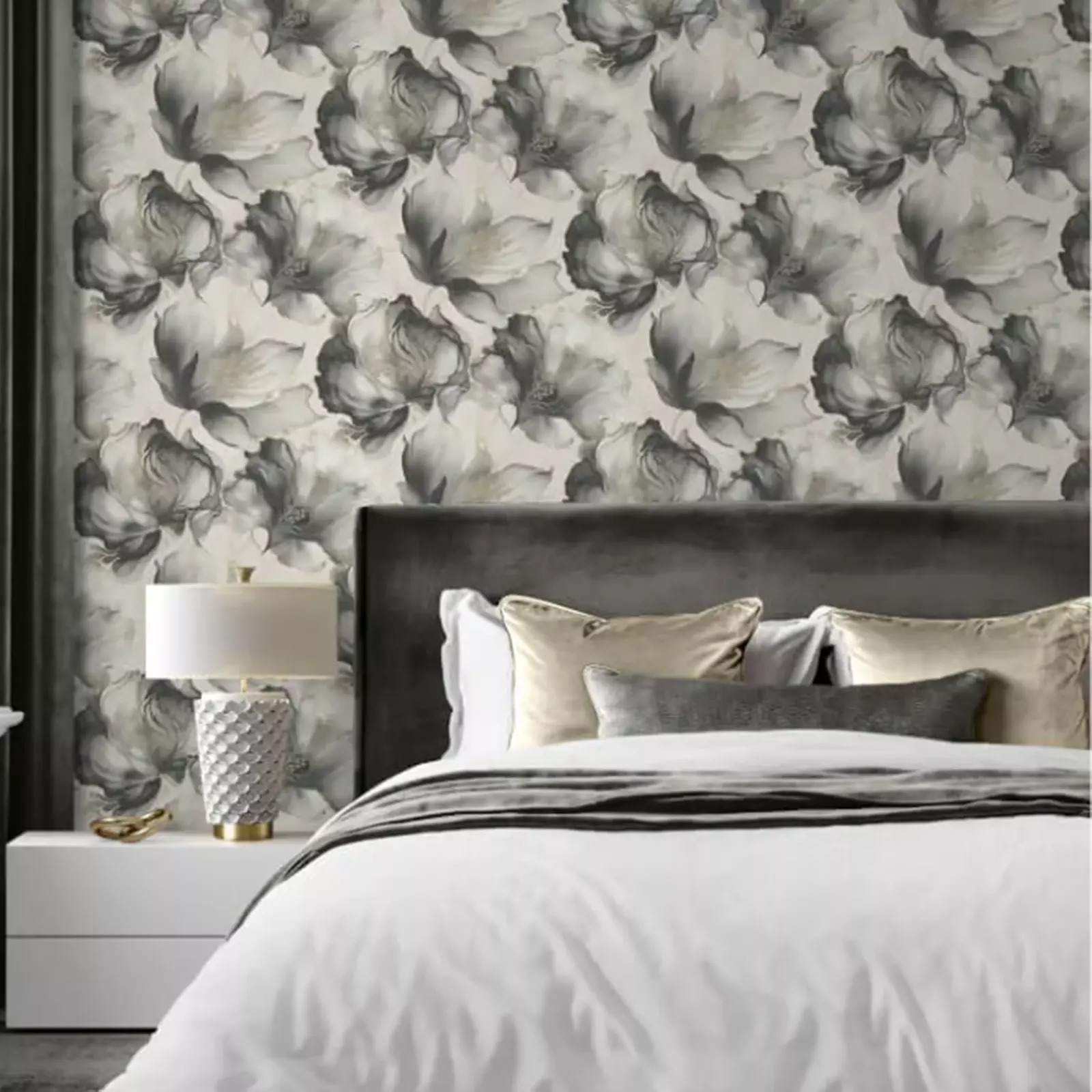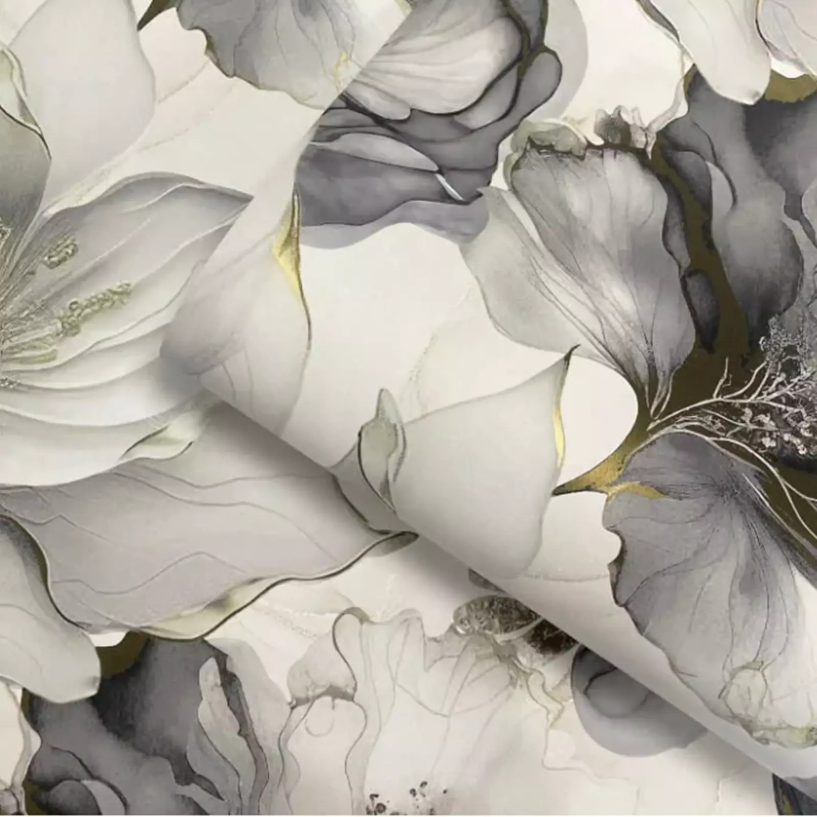 Muriva Wallpaper (212502) features a striking black and white floral design, enhanced with shimmering gold metallic accents on the petals, creating a luxurious and elegant look. The bold contrast between the black background and the delicate white flowers adds depth and sophistication to any space. The metallic gold details catch the light, adding a subtle glow and a touch of glamour. Ideal for bedrooms, hallways, or feature walls, this wallpaper adds a modern yet timeless touch to your interior. Crafted from high-quality material, it is durable, easy to apply, and perfect for creating a chic and refined atmosphere.