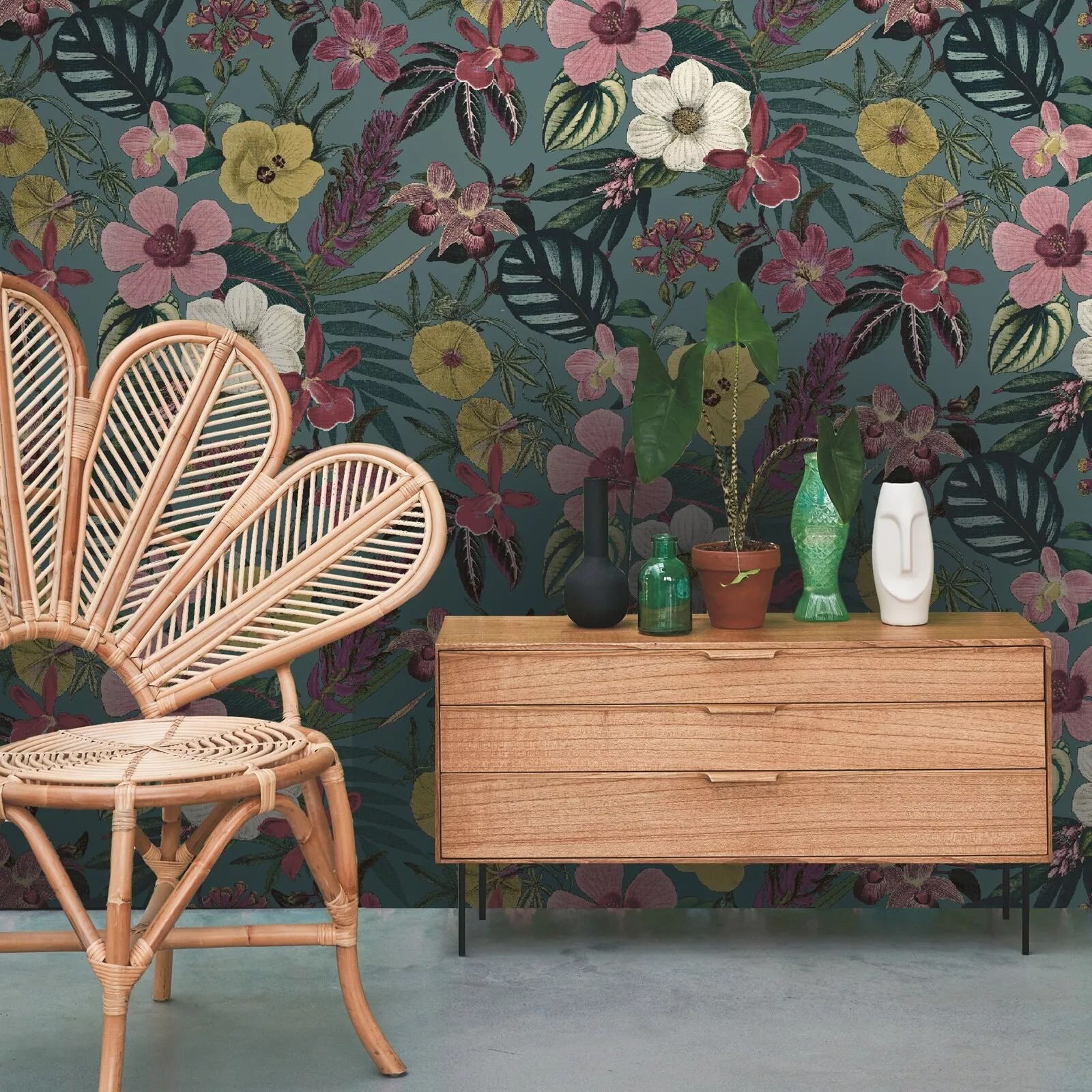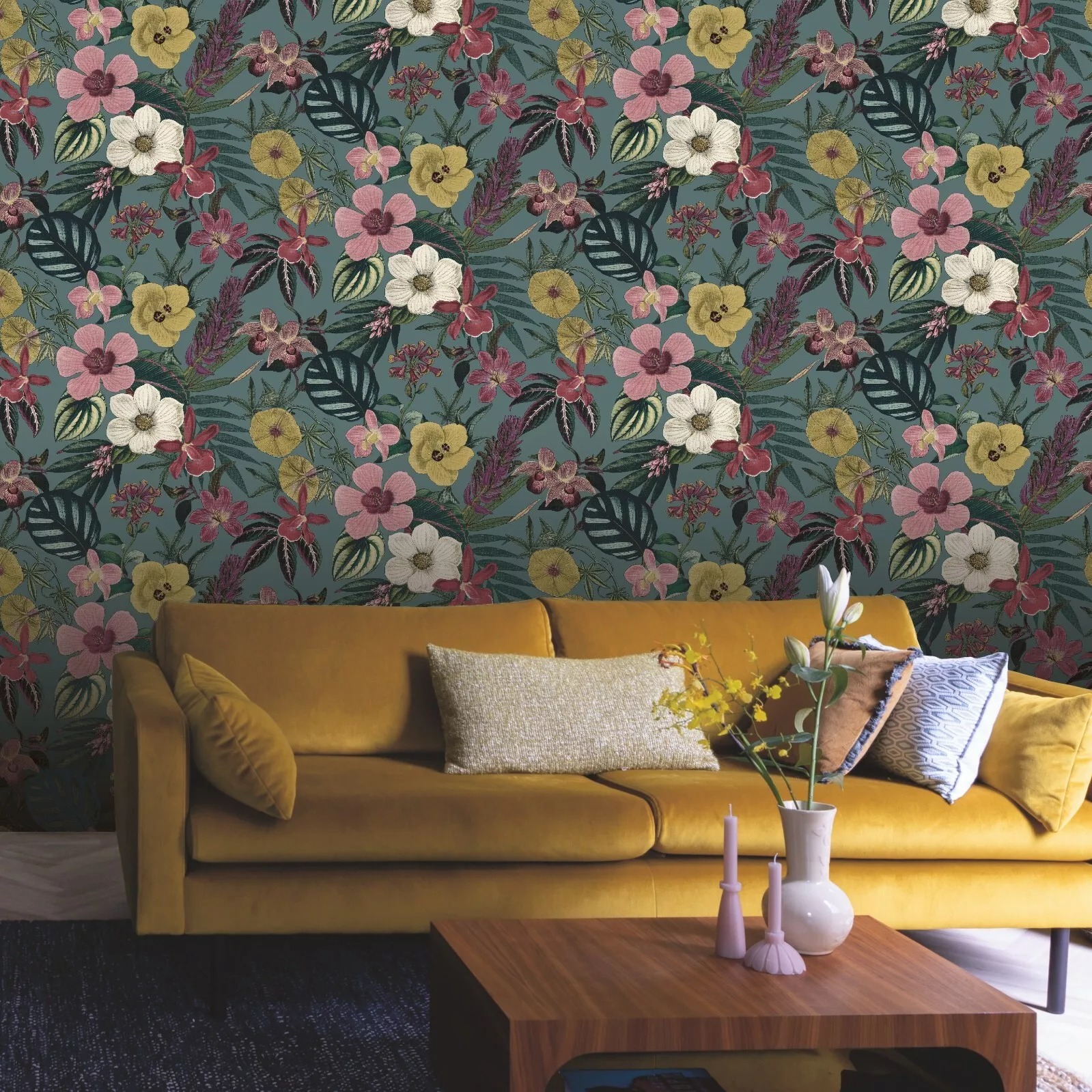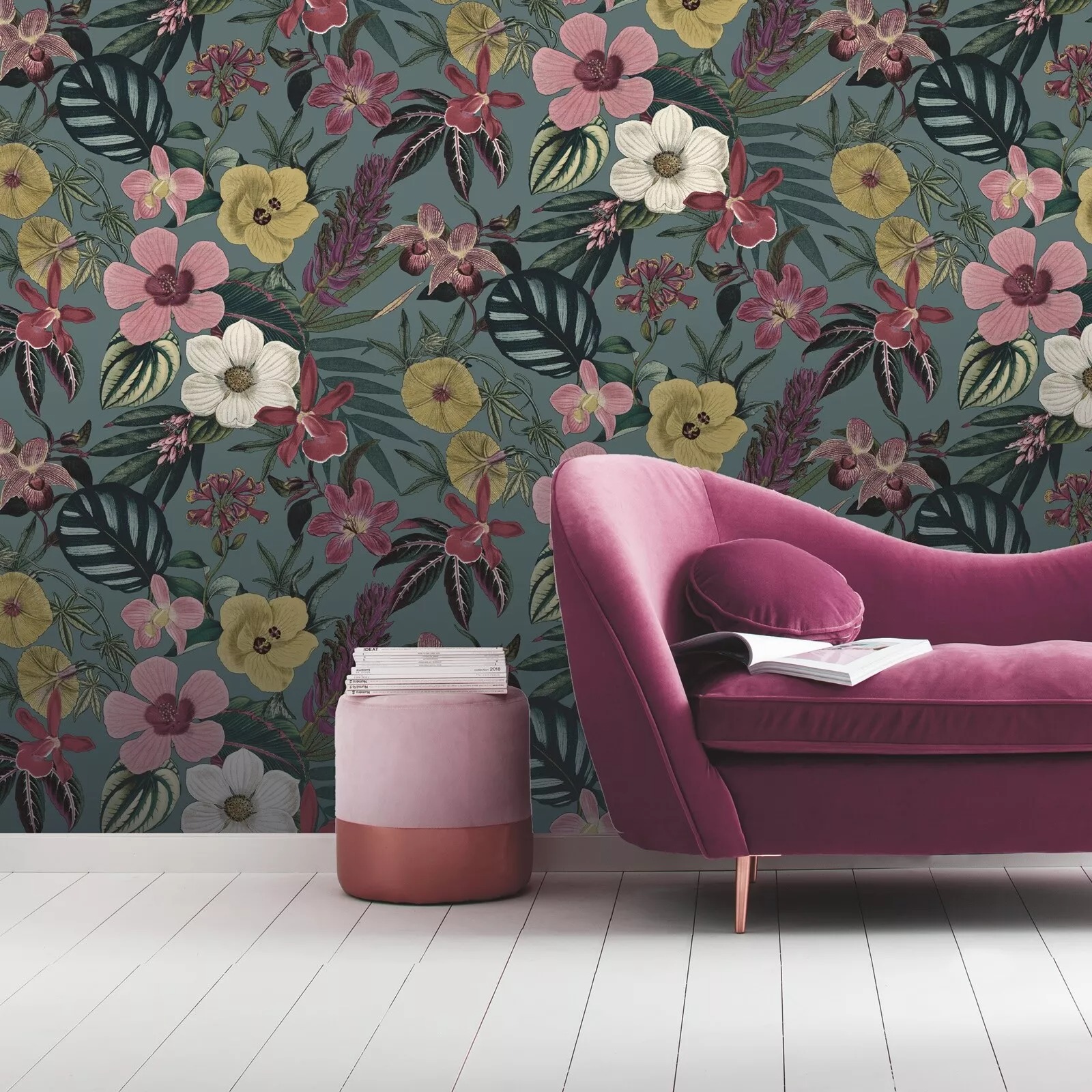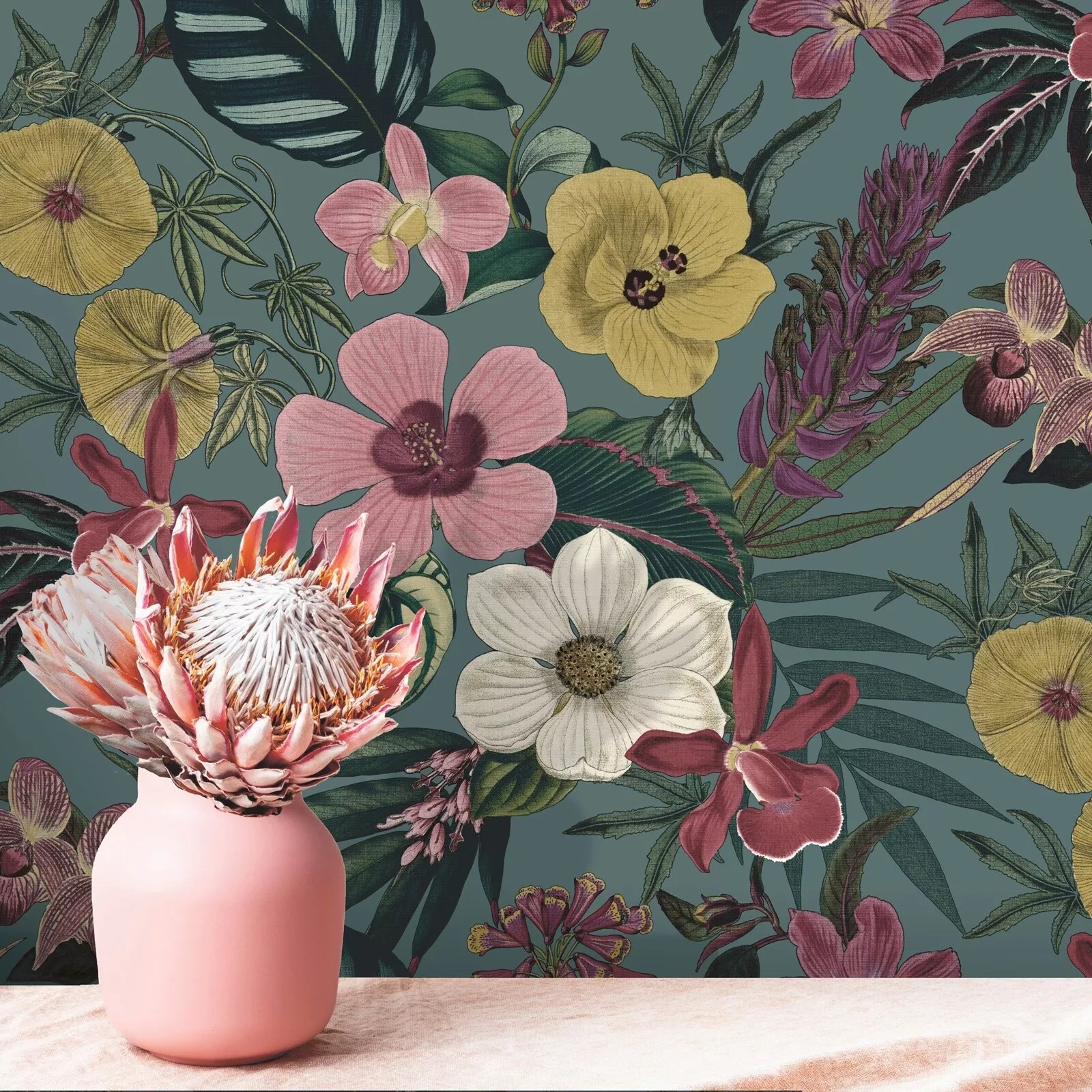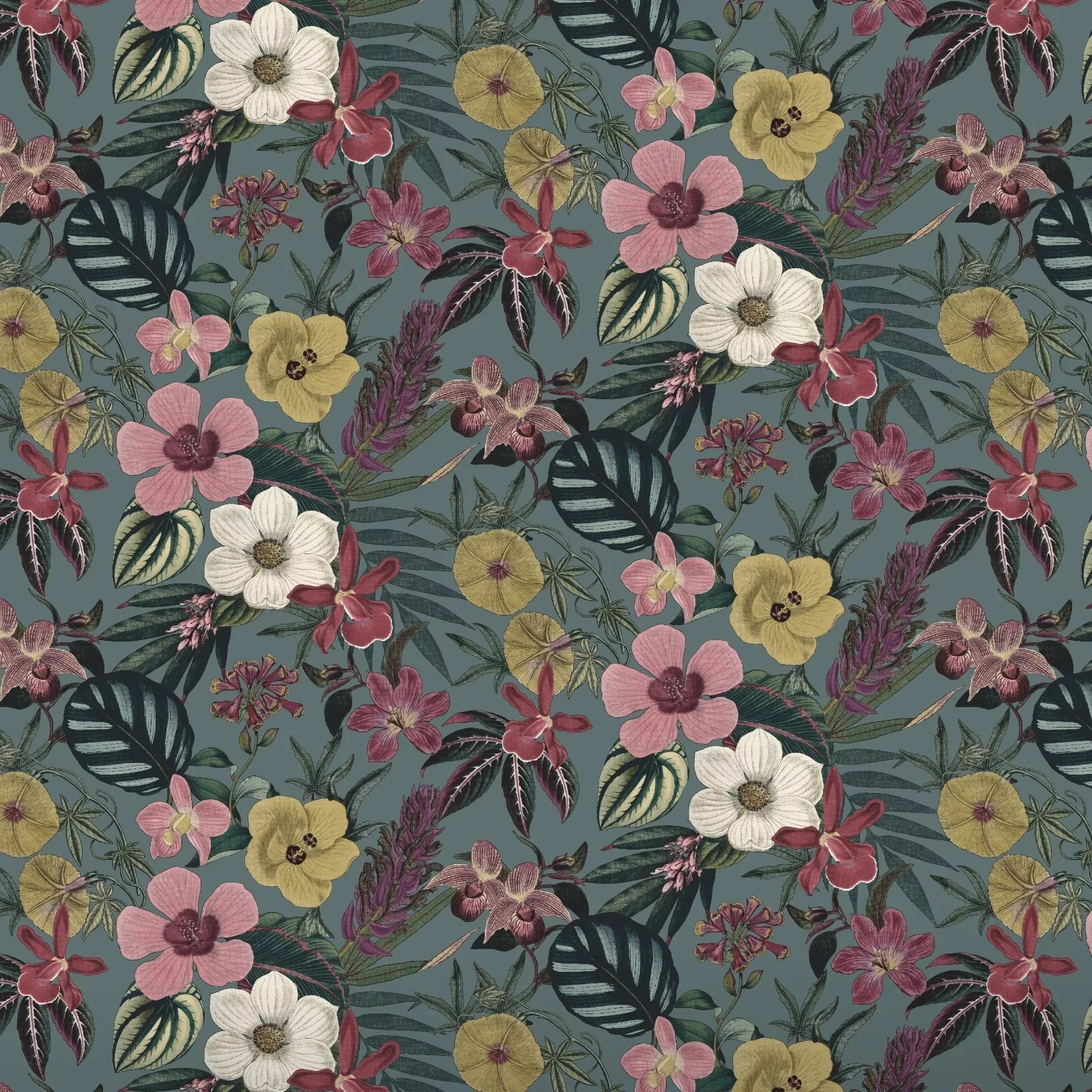 Teal Floral Orchid Palm Leaves Wallpaper Pink Yellow