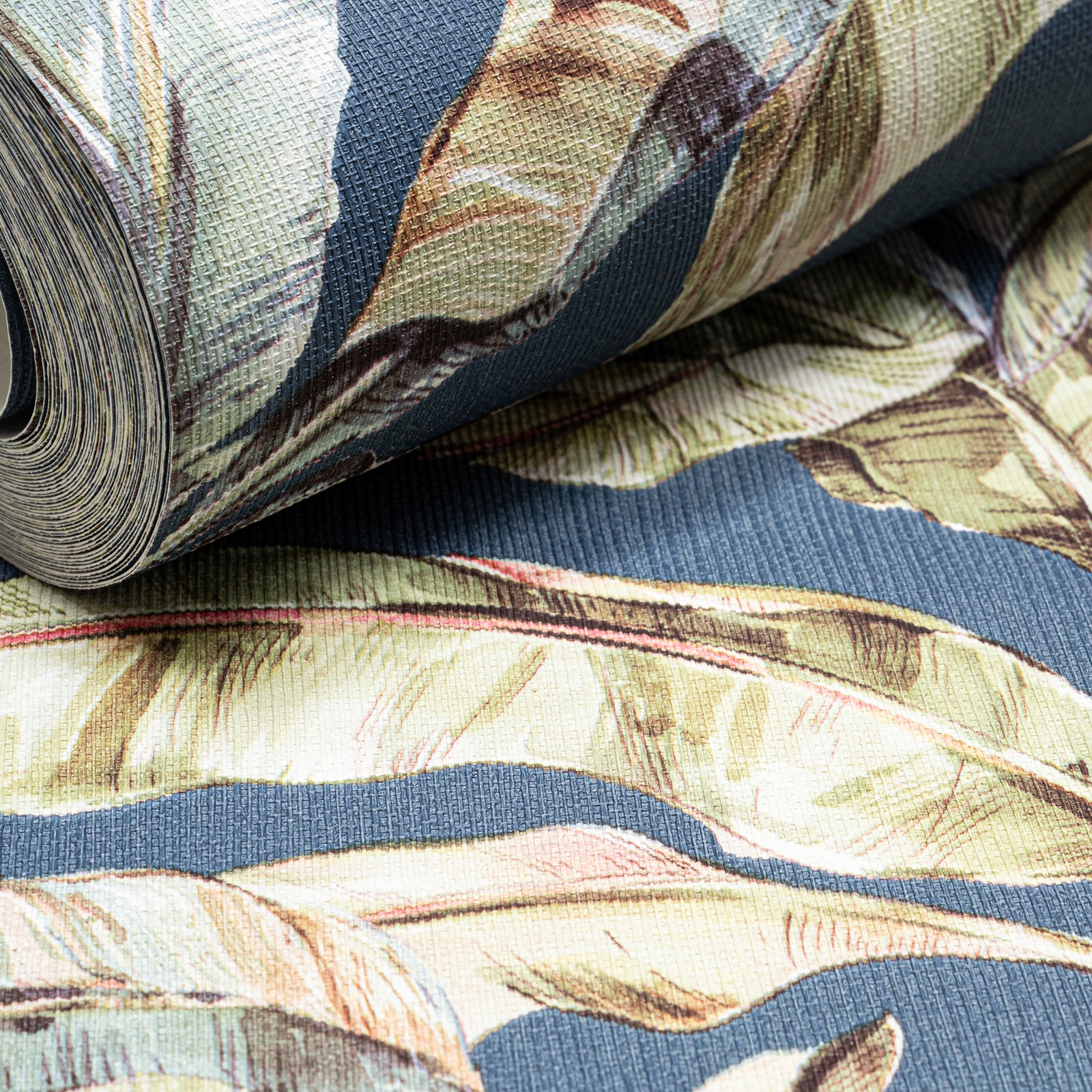 Add a tropical theme to the home interior with 485288 Jungle Leaves Wallpaper from the Florentine collection by Rasch featuring colourful palm leaves set against a linen weave effect textured ground. Printed on an excellent quality non-woven substrate for ease during application, Rasch 485288 Jungle Leaves wallpaper is shown here in shades of green set against a blue background.